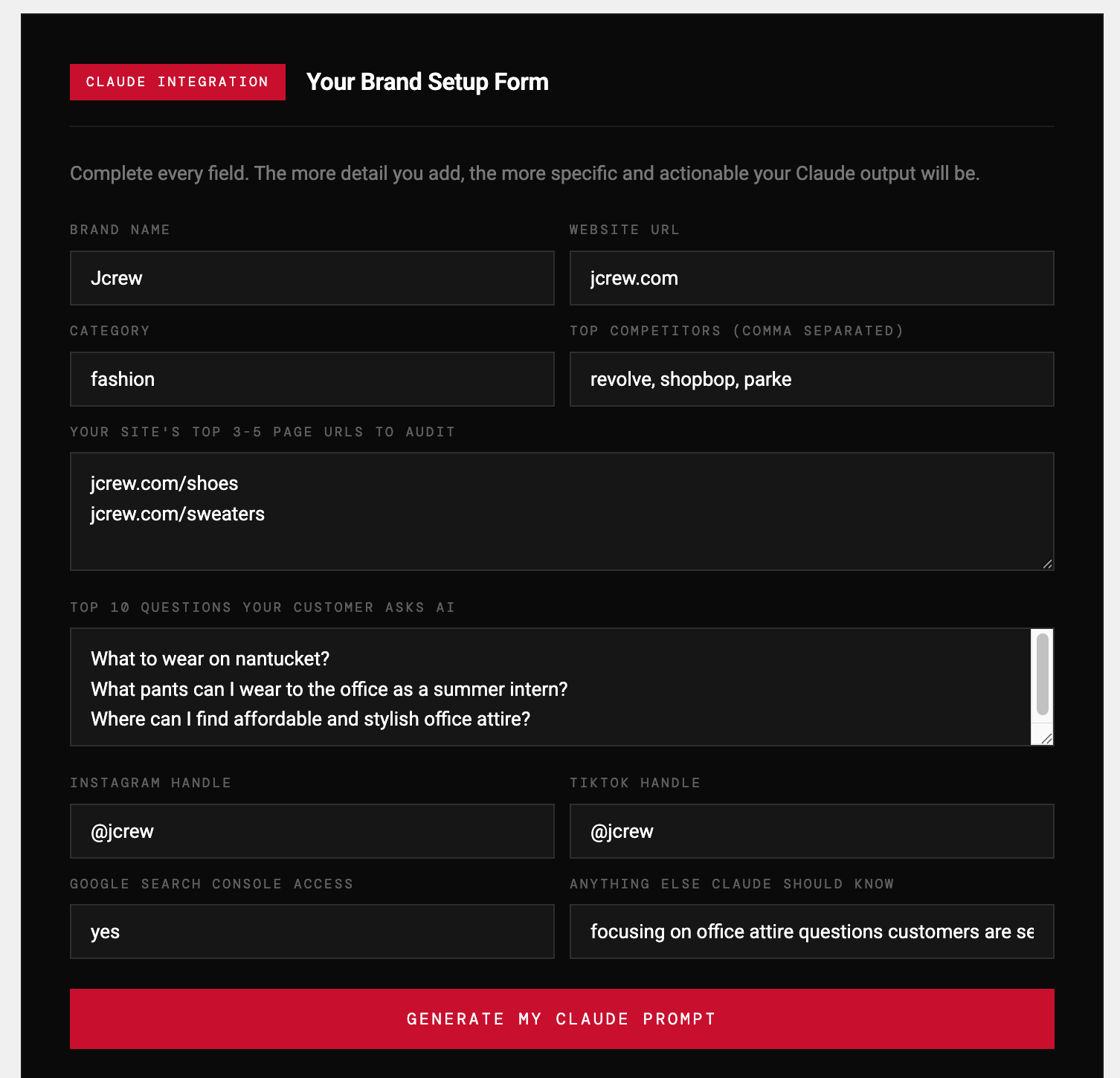 This means Claude writes the JSON-LD code for you based on your brand details and tells you exactly where to paste it in your Shopify, Squarespace, or custom site.
